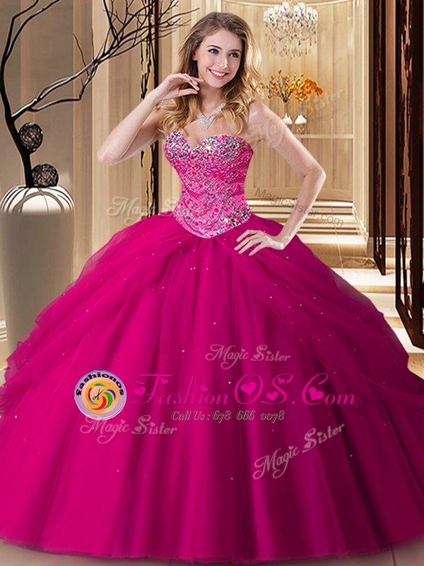 Home >  Quinceanera Dresses >  Cheap Quinceanera Dresses > Best Fuchsia Tulle Lace Up Sweetheart Sleeveless Floor Length Ball Gown Prom Dress Beading