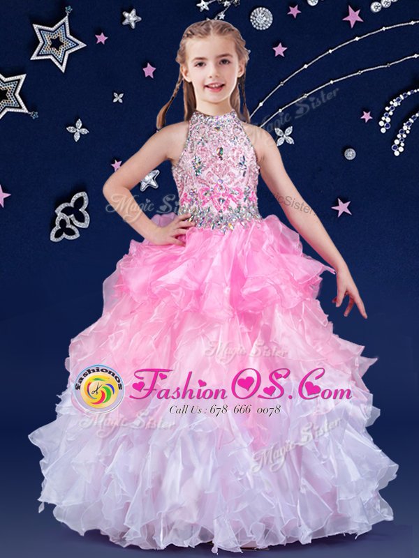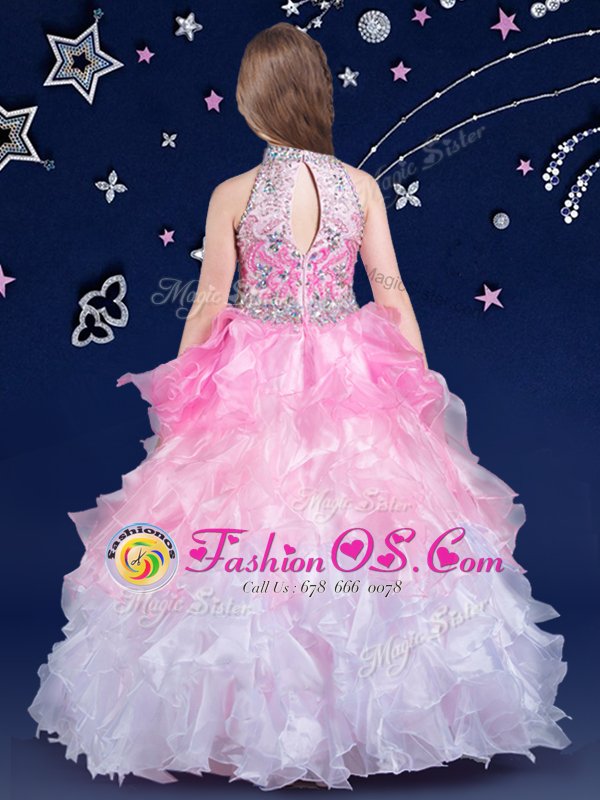 Home >  Special Occasion Dresses >  Mini Quinceanera Dresses > Best Halter Top Sleeveless Zipper Floor Length Beading and Ruffles Flower Girl Dress
