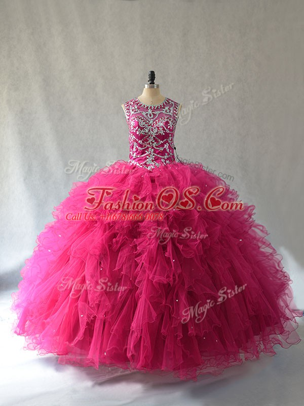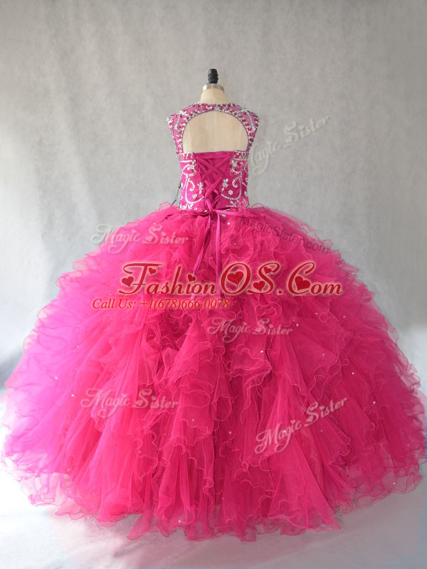 Best Hot Pink Lace Up Scoop Beading Sweet 16 Quinceanera Dress Tulle Sleeveless