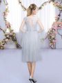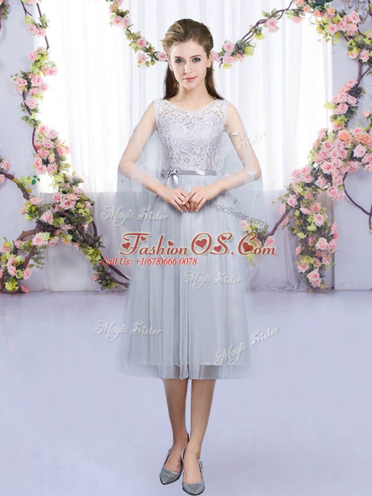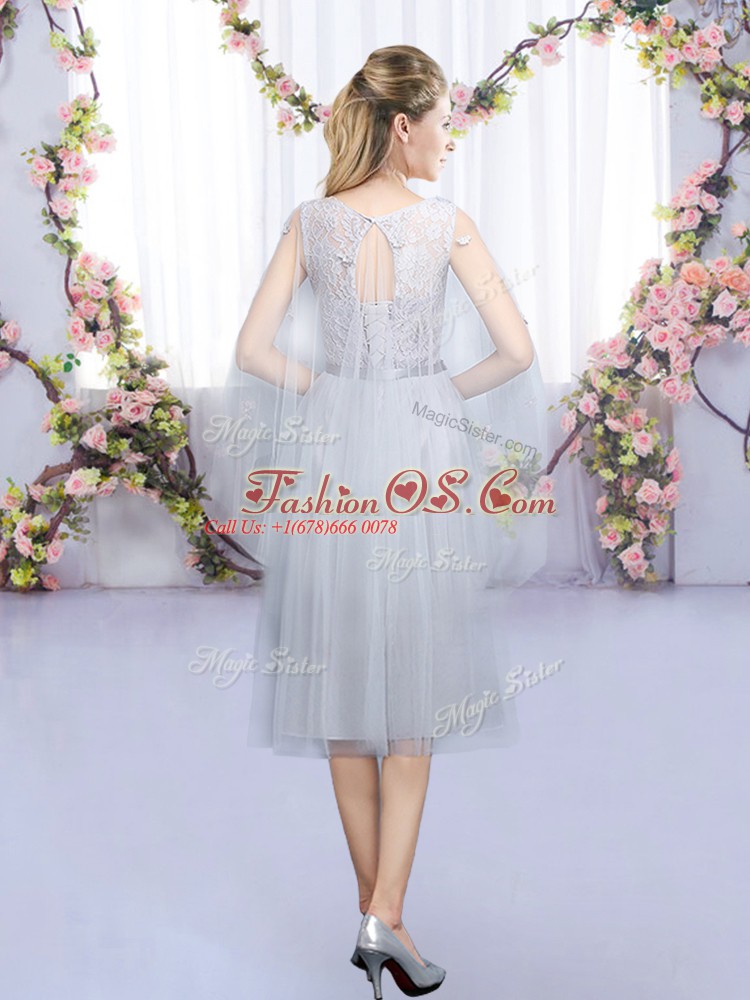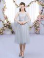 Best Lace and Belt Dama Dress for Quinceanera Grey Lace Up Sleeveless Tea Length