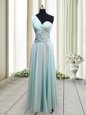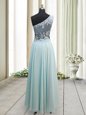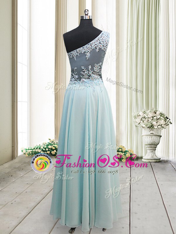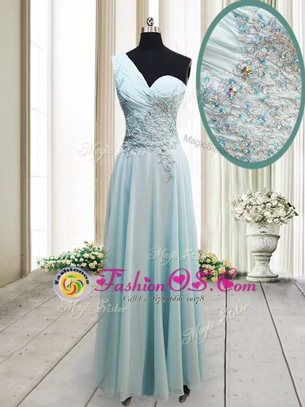 Best One Shoulder Ankle Length Side Zipper Hoco Dress Light Blue and In for Prom and Party with Beading and Appliques