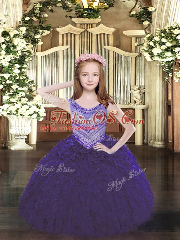 Best Purple Sleeveless Floor Length Beading and Ruffles Lace Up Kids Pageant Dress