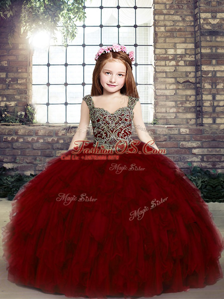 Home >  Special Occasion Dresses >  2019 Little Girl Pageant Dresses > Best Red Tulle Lace Up Straps Sleeveless Floor Length Little Girls Pageant Gowns Beading and Ruffles