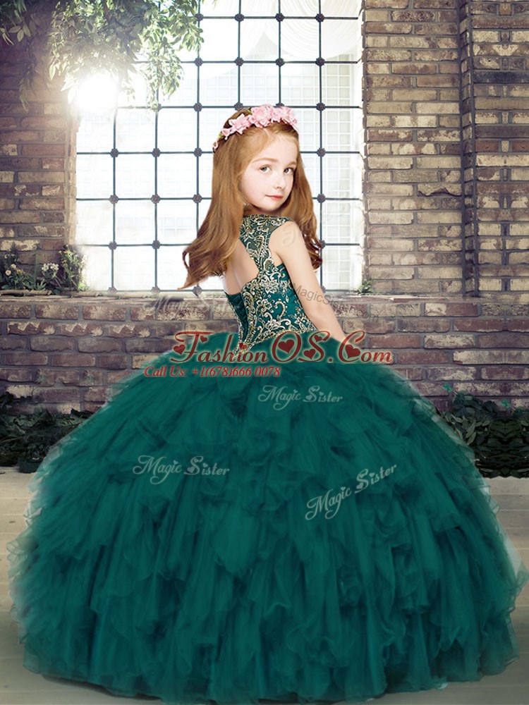 Best Red Tulle Lace Up Straps Sleeveless Floor Length Little Girls Pageant Gowns Beading and Ruffles