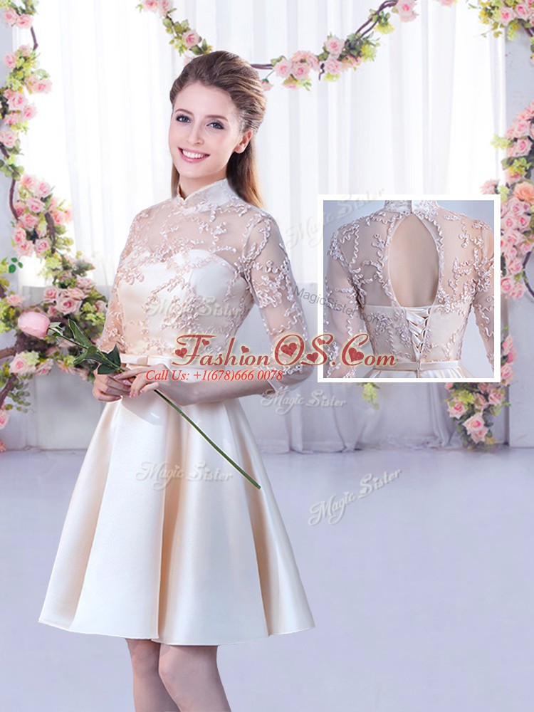 Best Selling A-line Damas Dress Champagne Scoop Satin Sleeveless Mini Length Lace Up