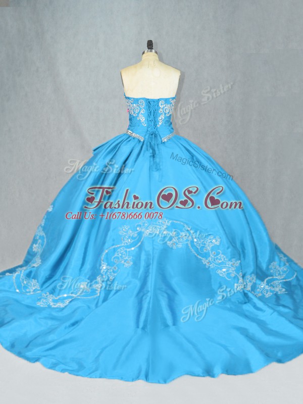 Best Selling Baby Blue Ball Gowns Sweetheart Sleeveless Satin and Tulle Court Train Lace Up Embroidery Sweet 16 Dress