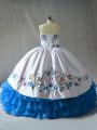 Home >  Quinceanera Dresses >  Pretty Quinceanera Dresses > Best Selling Floor Length Blue And White Vestidos de Quinceanera Organza Sleeveless Embroidery and Ruffled Layers