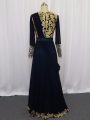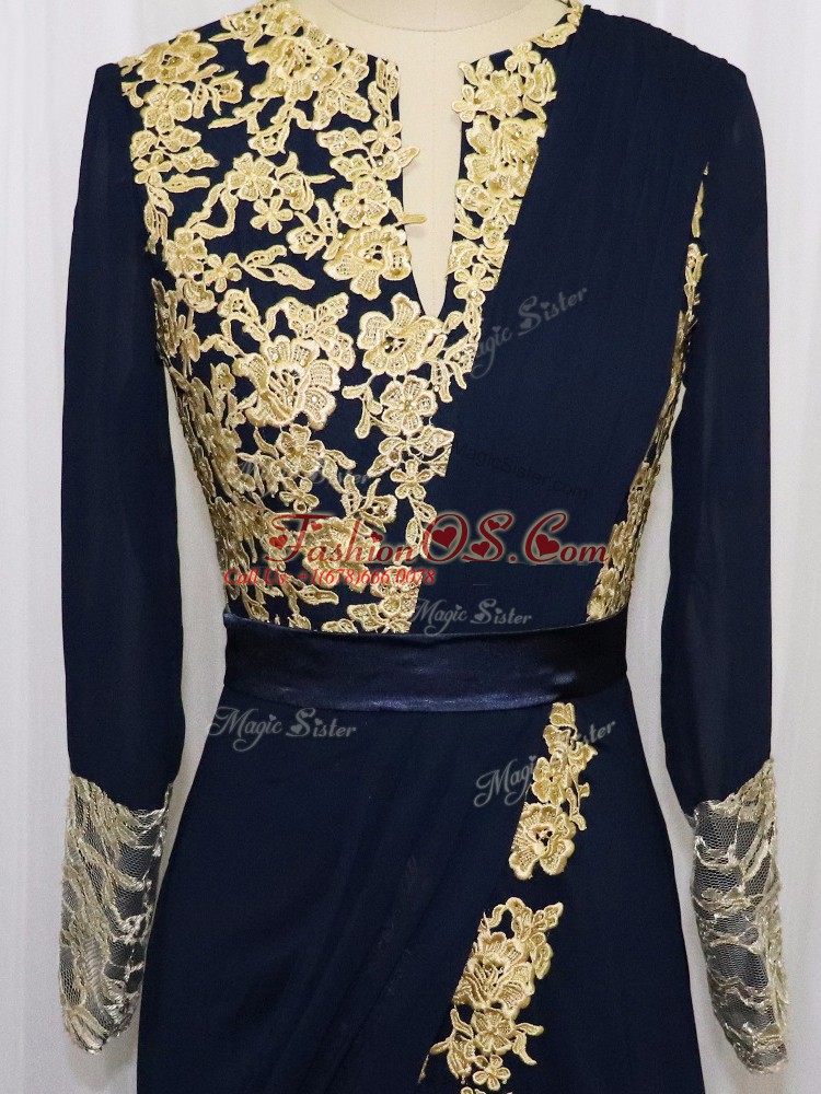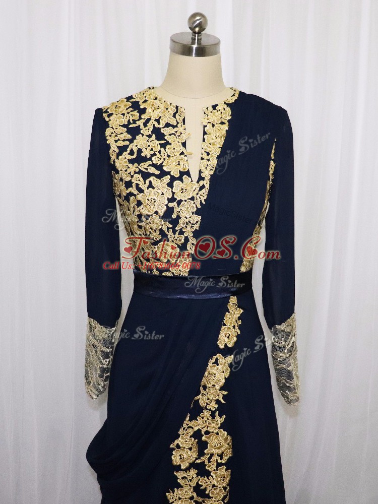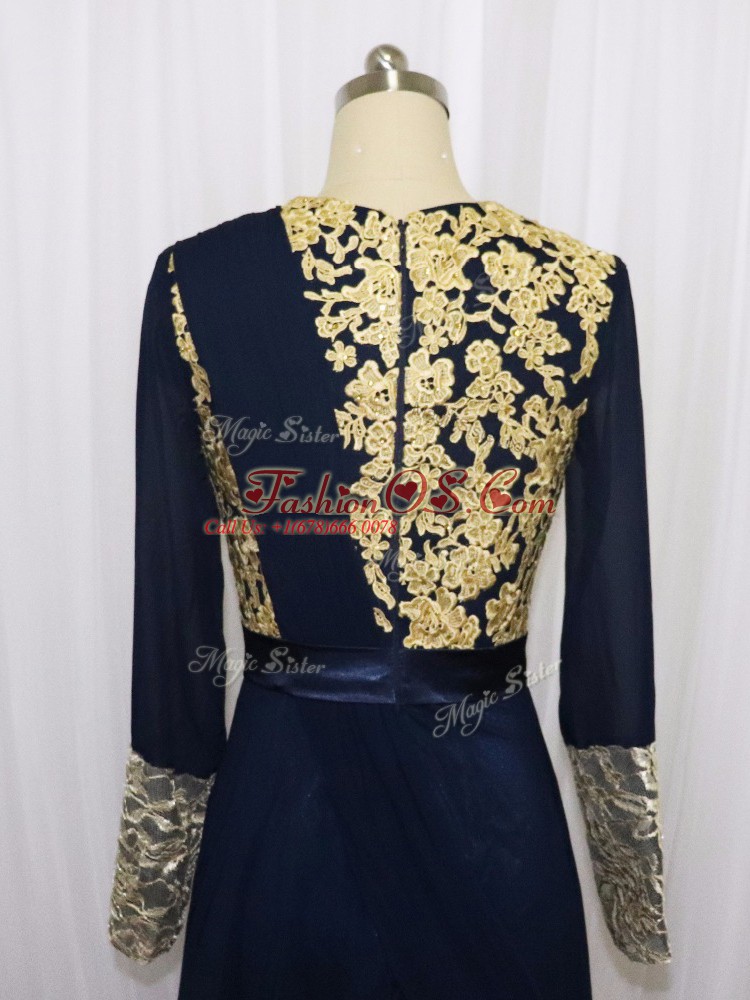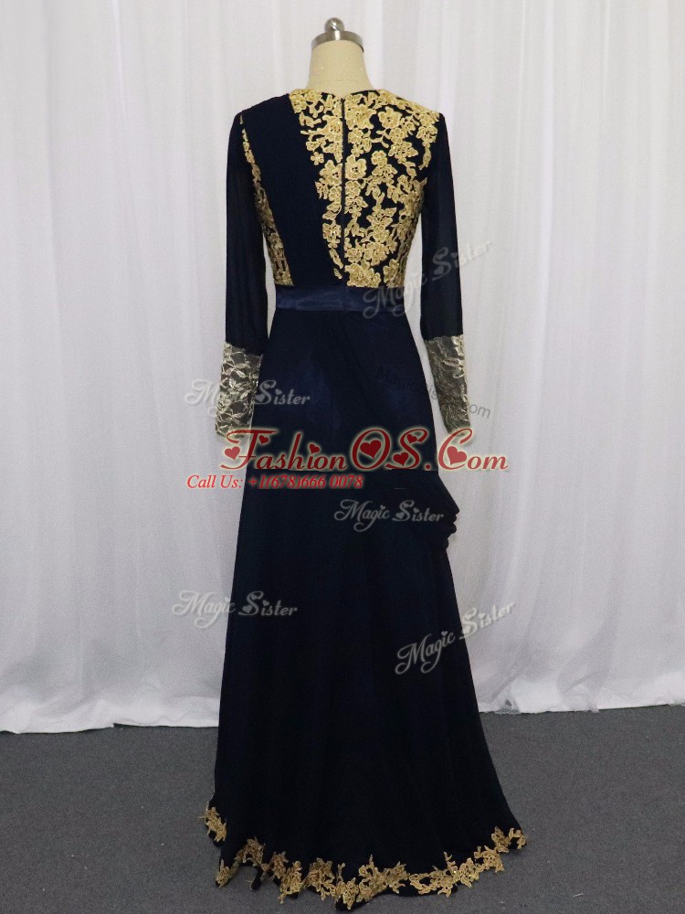 Best Selling Scoop Long Sleeves Prom Dresses Floor Length Lace and Appliques Navy Blue Chiffon
