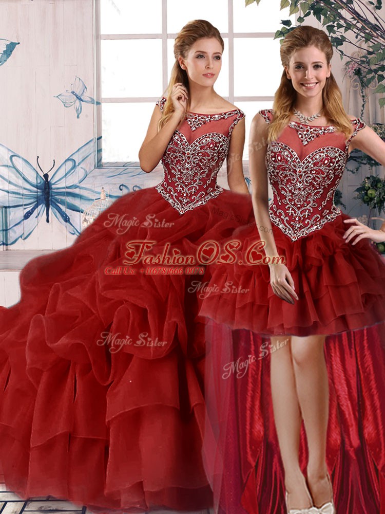 Best Selling Sleeveless Beading and Pick Ups Zipper Sweet 16 Dresses with Wine Red Brush Train