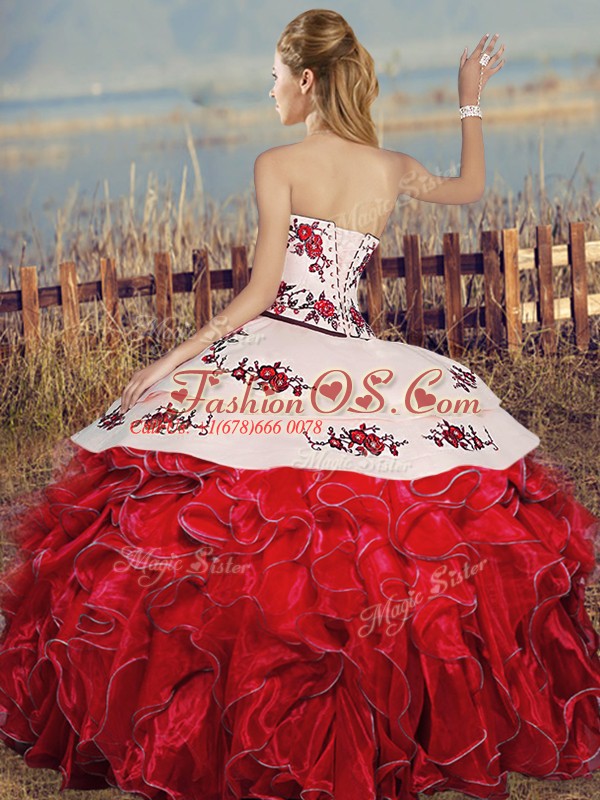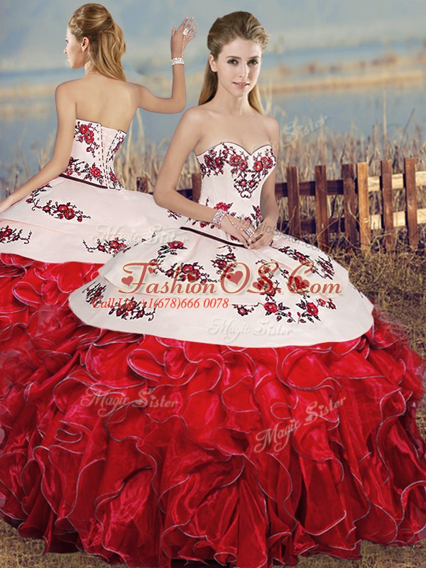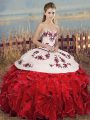 Best Selling White And Red Sweetheart Neckline Embroidery and Ruffles Quinceanera Dress Sleeveless Lace Up