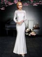 Best Selling White Column/Sheath Off The Shoulder Long Sleeves Elastic Woven Satin Floor Length Backless Ruching