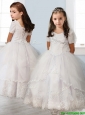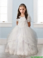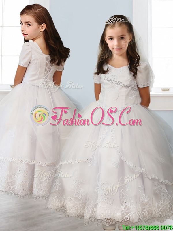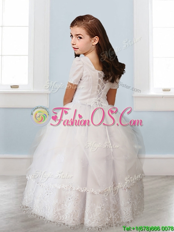 Best Square Short Sleeves White Little Girl Pageant Dress with Beading and Appliques