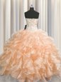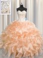 Home >  Quinceanera Dresses >  Custom Made Quinceanera Dresses > Best Visible Boning Zipper Up Peach Organza Zipper Sweetheart Sleeveless Floor Length Ball Gown Prom Dress Beading and Ruffles