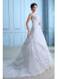 Romantic style dresses have a certain charm that never goes out of style! This one is the right one you are looking for! The gown features a wide strap bedecked by a by lace like appliques bodice. The waist is flattered so slim by exquisite ruching and shining appliques. The skirt falls with striking ruffles at the bottom of the silhouette before extending into a gorgeous train in the back. Beautiful buttons completes the back wonderfully.