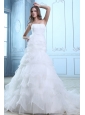 Fabulous and terrific! The beauty is beyond description! This strapless wedding gown is accented with ruched bodice with pleated bust,unique floral design creates a dramatic look of the dress. Special mermaid style is composed by layers of pleated organza which adds the charm and make the dress flirty.Pleated designed with hidden zipper up back finishes the look.Your figure is perfectly shaped by this flattering gown.