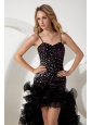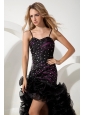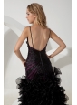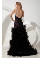 Feel special on your special day in this perfect dress. This funky black and purple dress is featured by a strap bodice and a sweetheart neckline. The ruched bodice hugs your curves past your hips shows your slim figure and radial beads covers whole bodice adds more fun and flirt to the dress. The high-low skirt with the intricate ruffles at the bottom with a small train give a amazing beauty of art. The zipper up open back finishes the look.