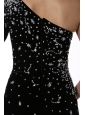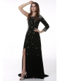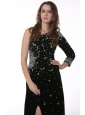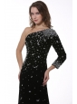 Black Beaded High Slit One Shoulder Prom Dress with 3/4 Length Sleeves