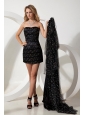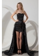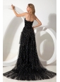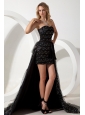 Heads will turn at your arrival if you wear this fabulous dress. This black high-low style prom dress features a sweetheart neckline and the whole dress is adorned with fashionable and colorful paillettes. An elegant and flowy attached train that cascades to the floor is placed by a waistband. I am sure you will like this wonderful dress.