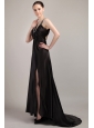 This flirty sexy dress accents an V-neck neckline ,a sexy open back,a floor-length skirt with slips on the side. All this features create a sexy look. The train of the skirt makes the dress elegant and graceful.The beads on the straps and the back gives the dress a shinning effect. Wearing the dress, you will surely attract lots of appreciated eyes.