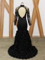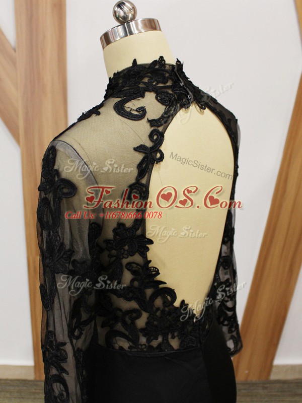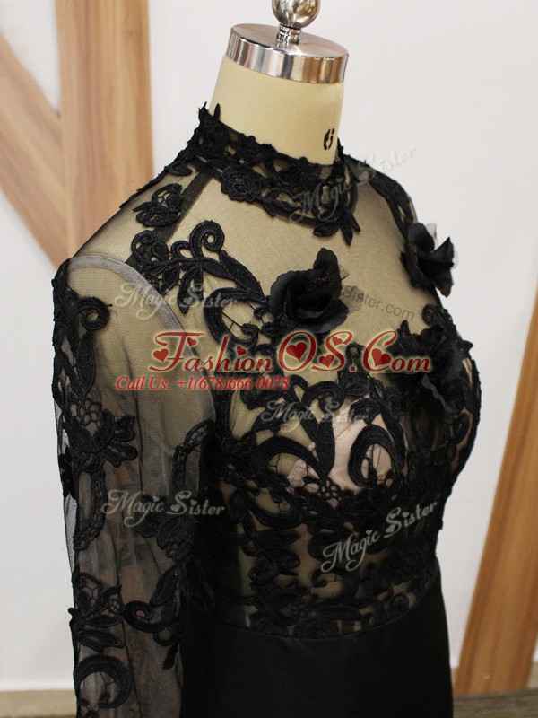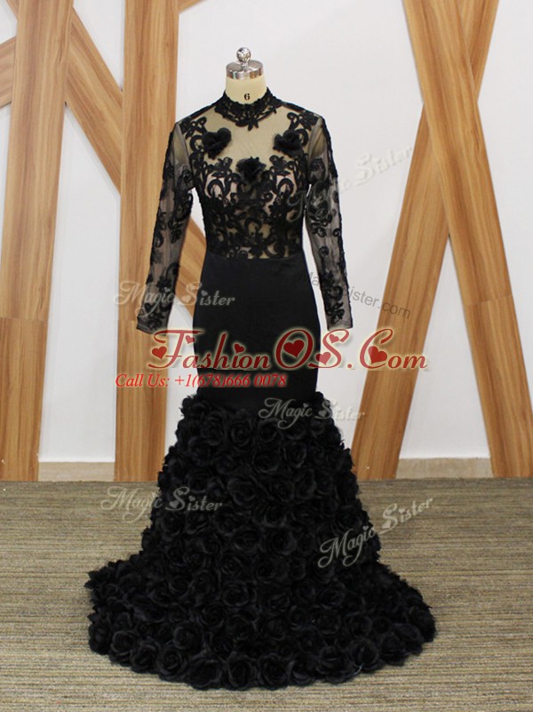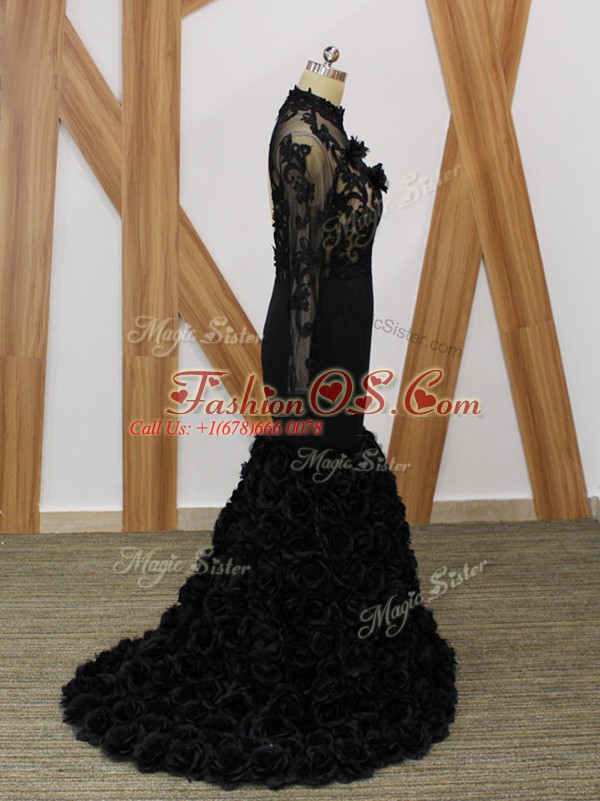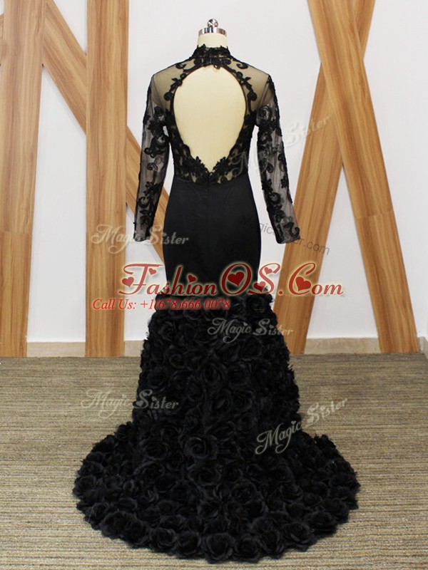Black Fabric With Rolling Flowers Backless Mother Of The Bride Dress Long Sleeves Brush Train Beading and Lace and Appliques and Hand Made Flower
