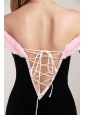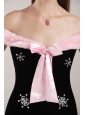This gorgeous black off-the-shoulder prom dress is featured with the beautiful neckline made of soft fabric and the pink bow . Which makes the dress look lovely. The snowflake shaped beading on the whole skirt contrasts with the black skirt , which has a strong visual impact. And the thin strings on the back completes the look.