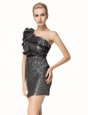 Black Satin Zipper One Shoulder Sleeveless Mini Length Prom Dresses Ruffles and Sashes|ribbons
