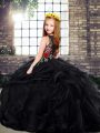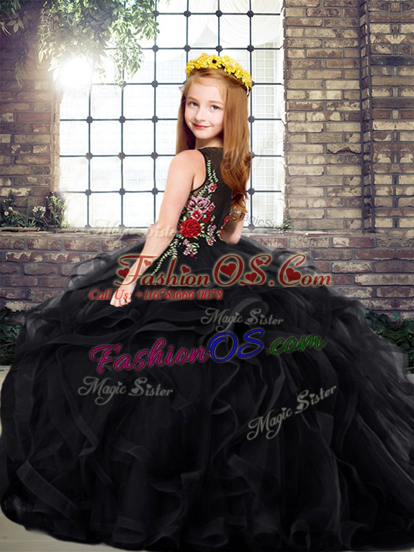 Black Scoop Zipper Embroidery and Ruffles Little Girl Pageant Gowns Sweep Train Sleeveless
