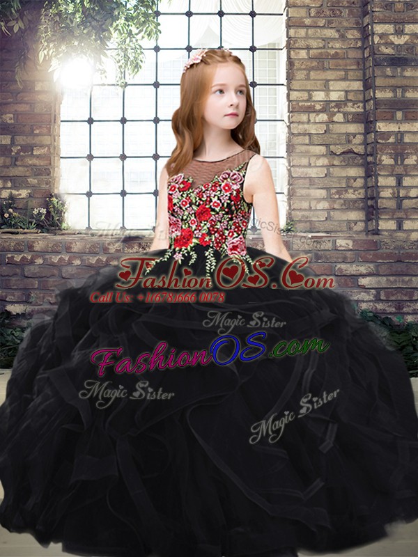 Home >  Special Occasion Dresses >  Lovely Little Girl Pageant Dresses > Black Scoop Zipper Embroidery and Ruffles Little Girl Pageant Gowns Sweep Train Sleeveless