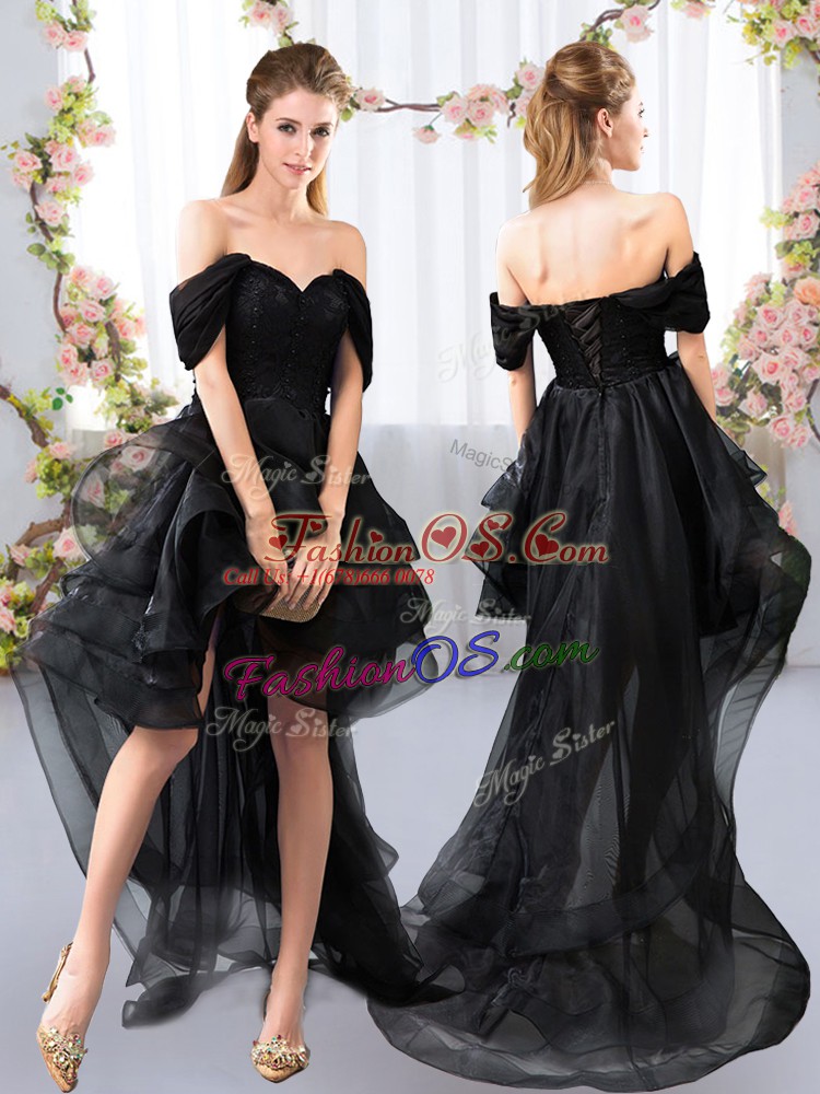 Black Short Sleeves Lace and Ruffled Layers High Low Bridesmaid Dress