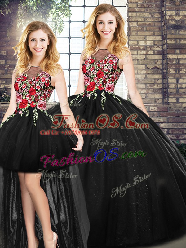 Black Sleeveless Floor Length Embroidery Zipper Quince Ball Gowns