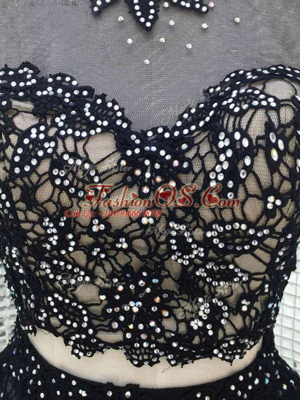 Black Sleeveless Mini Length Beading and Lace and Appliques Backless Evening Dress