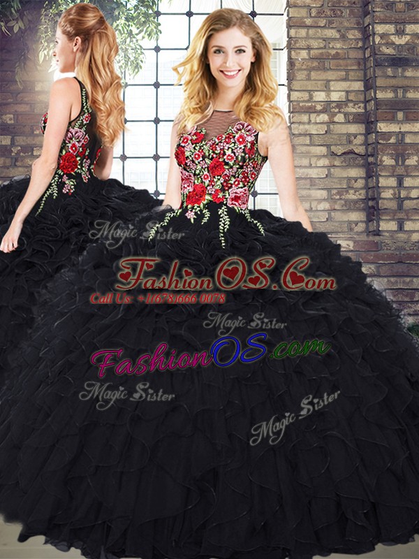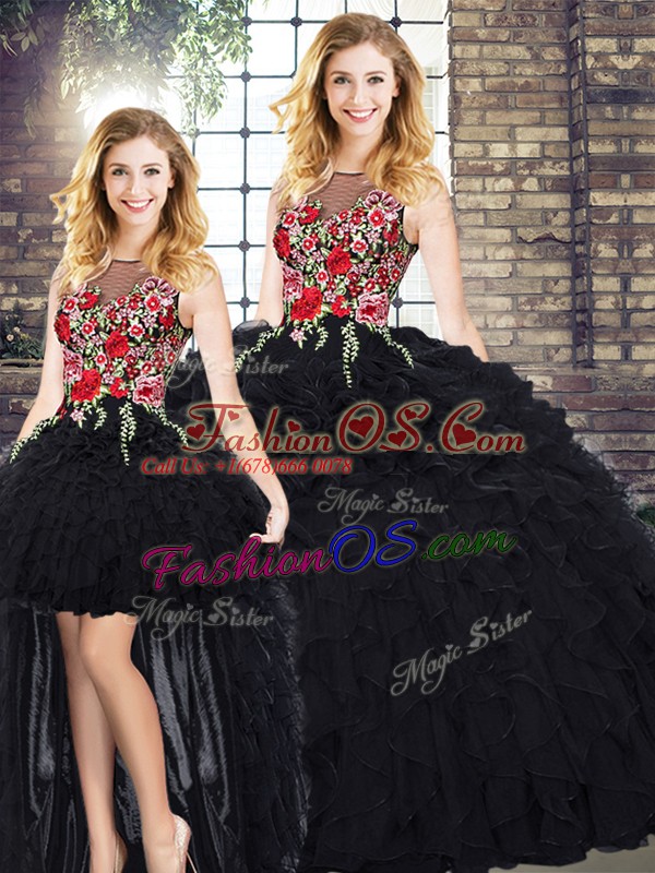 Black Zipper Quince Ball Gowns Embroidery and Ruffles Sleeveless Floor Length
