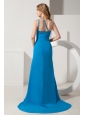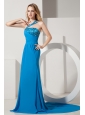 Blue A-line One Shoulder Brush Train Chiffon Beading Prom Dress