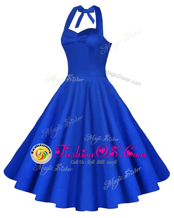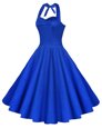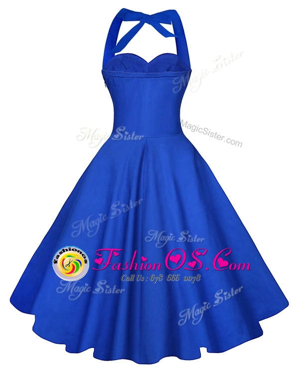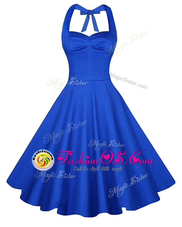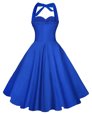 Blue A-line Sweetheart Sleeveless Satin Knee Length Backless Ruching Prom Evening Gown