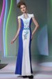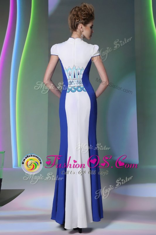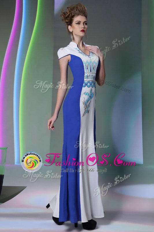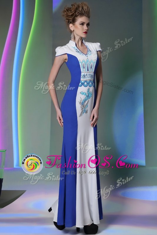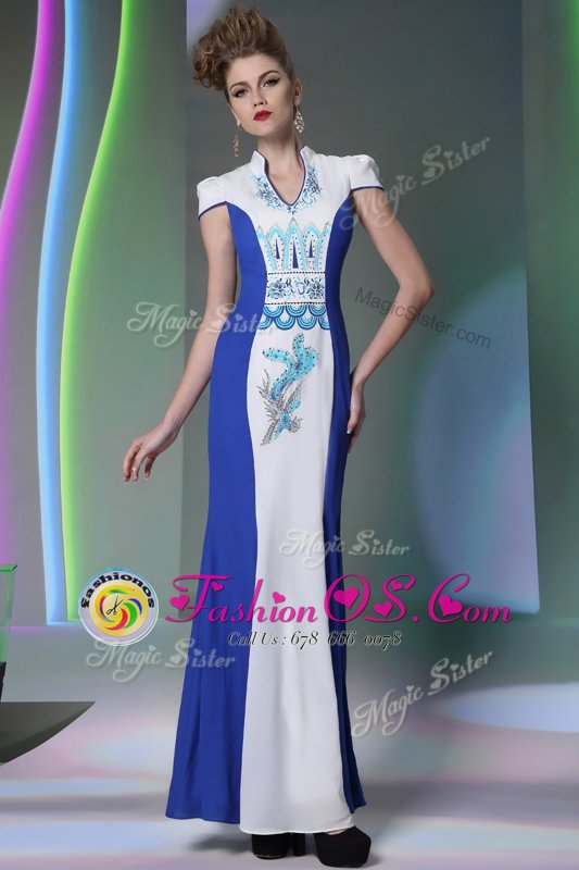 Home >  Prom Dresses >  Fashionable Prom Dresses > Blue And White Column/Sheath Embroidery Prom Evening Gown Zipper Chiffon Cap Sleeves Floor Length