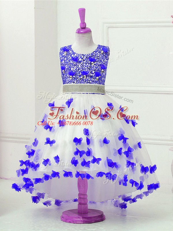 Blue And White Scoop Zipper Appliques and Sequins Little Girl Pageant Gowns Sleeveless
