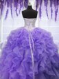 Blue Ball Gowns Organza One Shoulder Long Sleeves Beading and Embroidery and Hand Made Flower Floor Length Lace Up Sweet 16 Dress