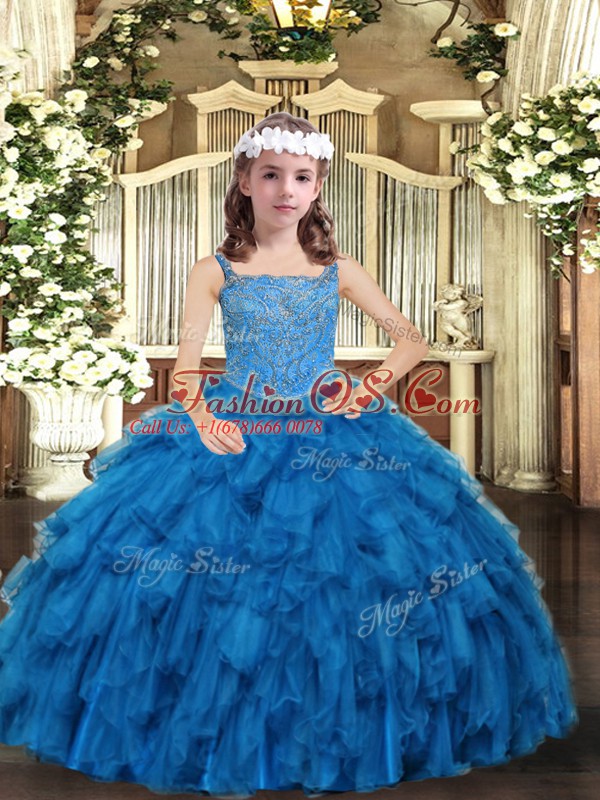 Home >  Special Occasion Dresses >  Beautiful Kids Pageant Dresses > Blue Ball Gowns Organza Straps Sleeveless Beading and Ruffles Floor Length Lace Up Pageant Gowns