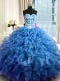 Home >  Quinceanera Dresses >  Perfect Quinceanera Dresses > Blue Ball Gowns Sweetheart Sleeveless Organza Floor Length Lace Up Beading and Ruffles Sweet 16 Dresses
