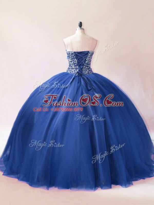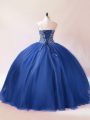 Blue Ball Gowns Sweetheart Sleeveless Tulle Floor Length Lace Up Beading Quinceanera Gowns