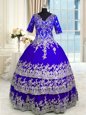 Home >  Quinceanera Dresses >  Perfect Quinceanera Dresses > Blue Ball Gowns V-neck Half Sleeves Satin and Tulle Floor Length Zipper Appliques and Ruffled Layers Quinceanera Gowns