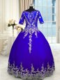 Blue Ball Gowns V-neck Half Sleeves Satin and Tulle Floor Length Zipper Appliques and Ruffled Layers Quinceanera Gowns
