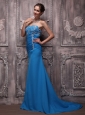 Blue Column Strapless Brush Train Chiffon Appliques Prom / Evening Dress
