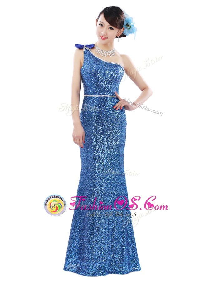 Blue Column/Sheath One Shoulder Sleeveless Sequined Floor Length Zipper Sequins Prom Party Dress