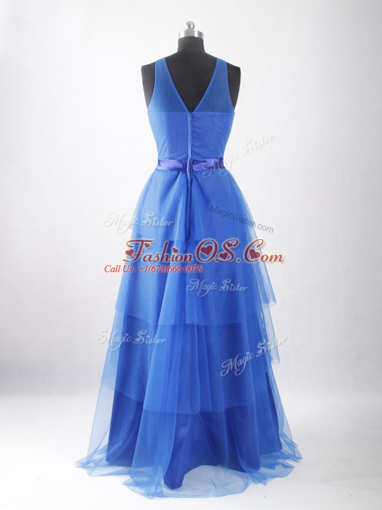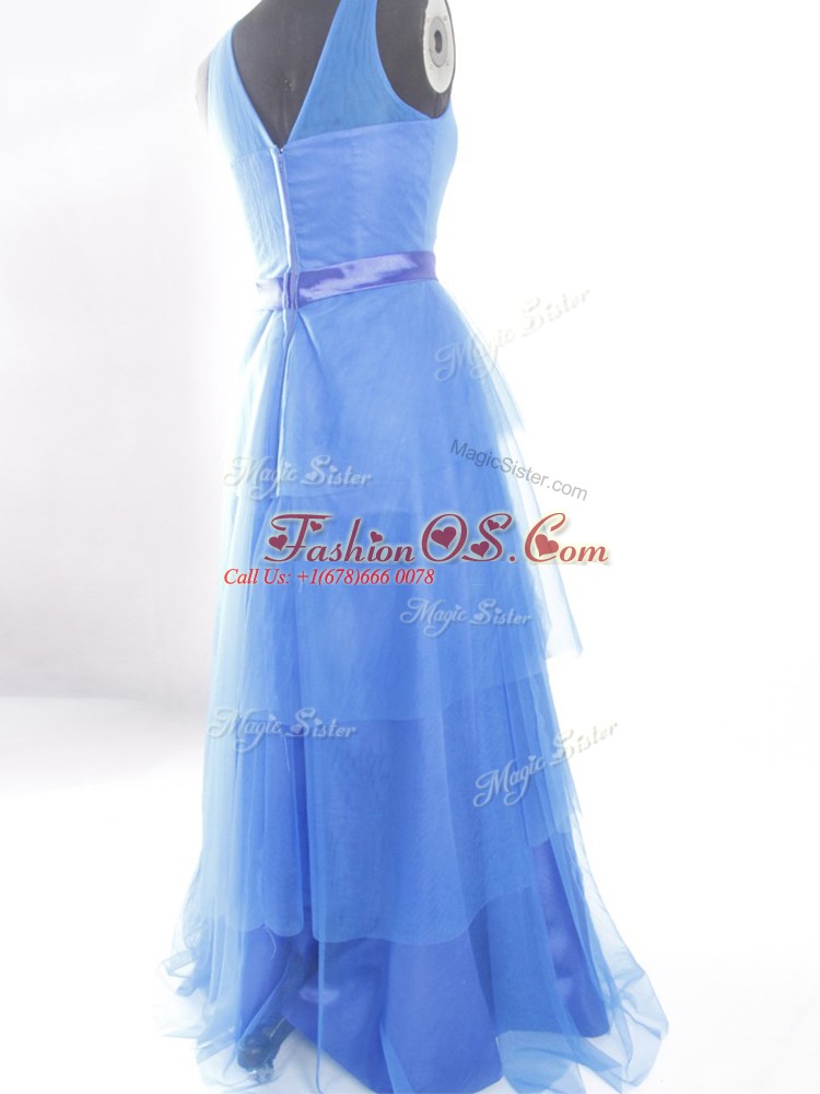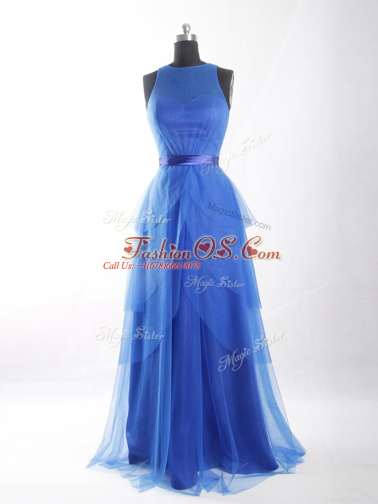 Blue Empire Scoop Sleeveless Tulle Floor Length Zipper Beading and Ruffled Layers and Belt Prom Gown
