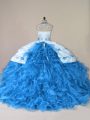 Blue Lace Up Halter Top Embroidery and Ruffles Vestidos de Quinceanera Organza Sleeveless Court Train
