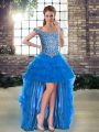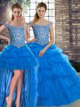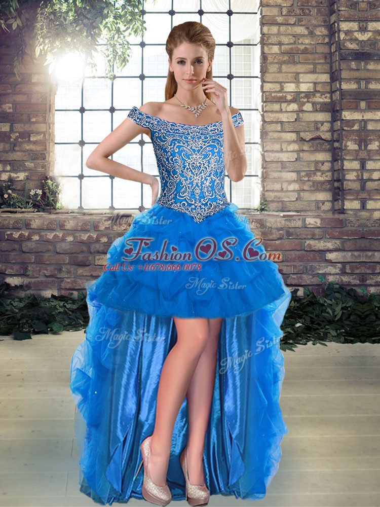 Blue Lace Up Off The Shoulder Beading and Pick Ups 15 Quinceanera Dress Tulle Sleeveless Brush Train