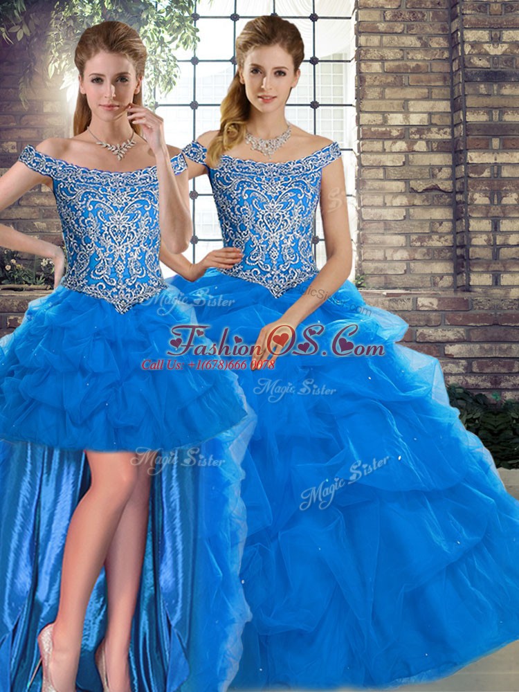 Home >  Quinceanera Dresses >  Detachable Quinceanera Skirts > Blue Lace Up Off The Shoulder Beading and Pick Ups 15 Quinceanera Dress Tulle Sleeveless Brush Train