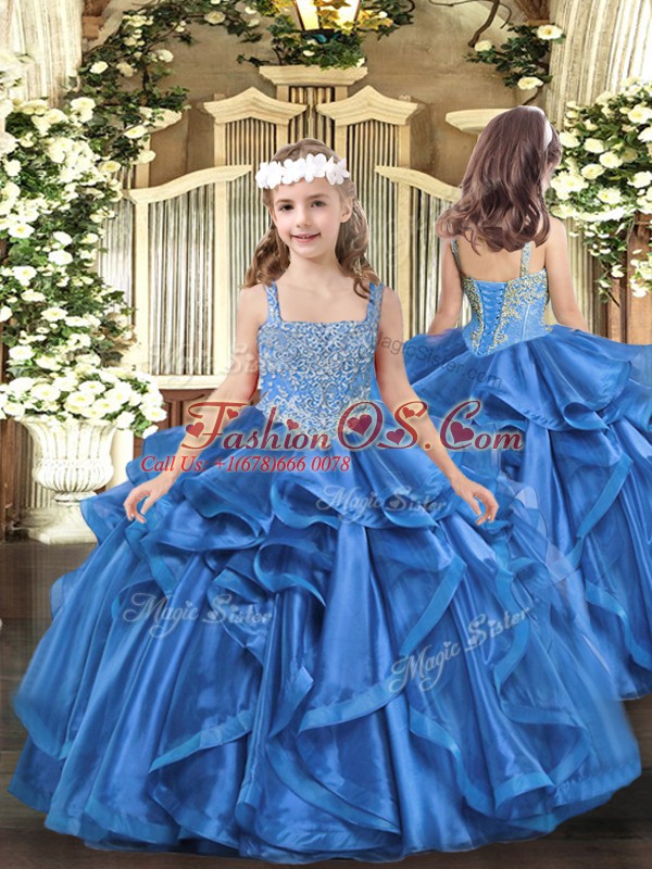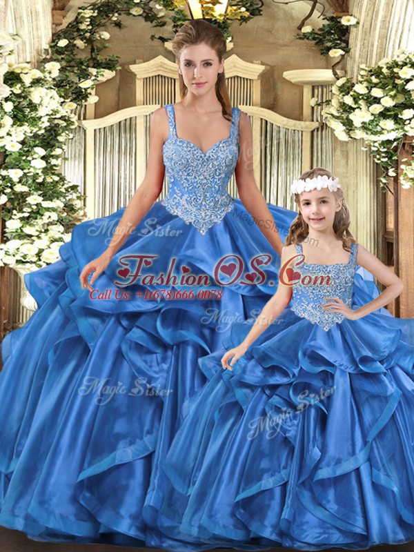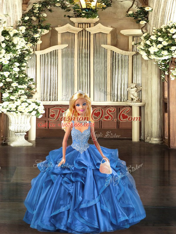 Blue Lace Up Straps Beading and Ruffles 15th Birthday Dress Tulle Sleeveless