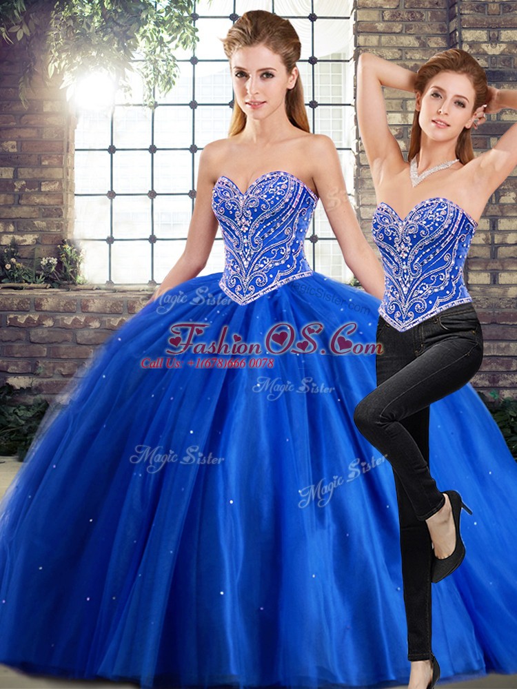 Blue Lace Up Sweet 16 Quinceanera Dress Beading Sleeveless Brush Train